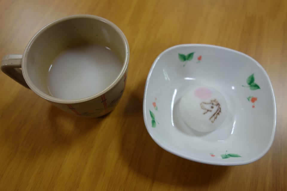 おやつでは、「甘酒」と干支の「馬の饅頭」が出ました。